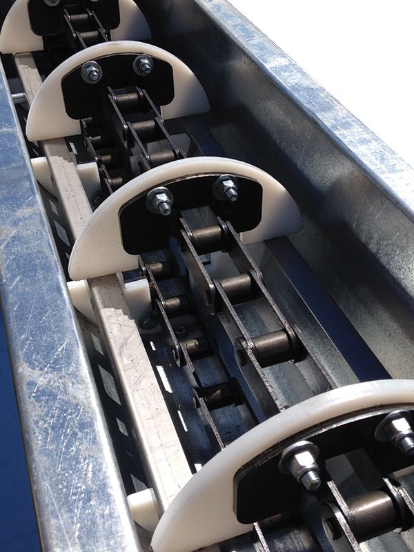 - Each UHMW paddle is bolted to a formed steel backer plate welded onto the chain